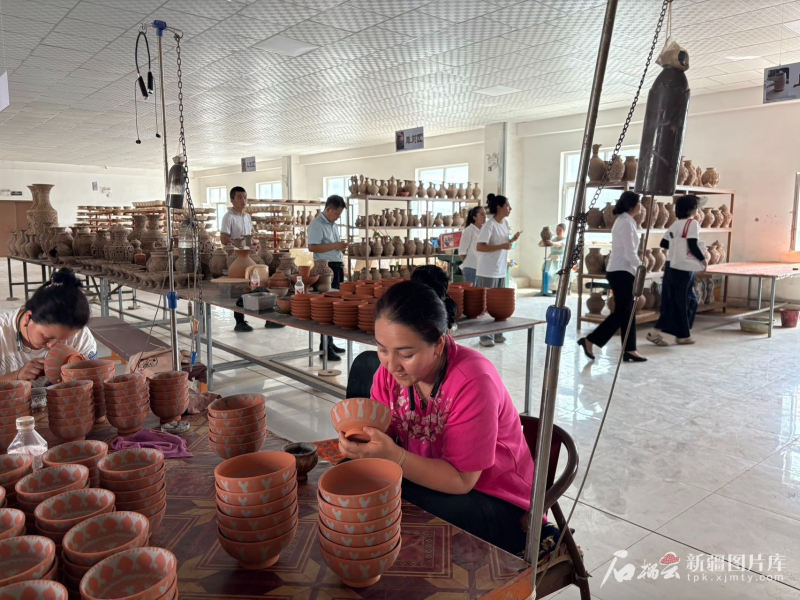 6月27日,阿克陶縣巴仁鄉就業實訓基地內的米拉斯土陶手工藝專業合作社裏,畫工們正用創新的方式勾勒土陶碗上的花紋。石榴雲/新疆日報記者 王晶晶攝