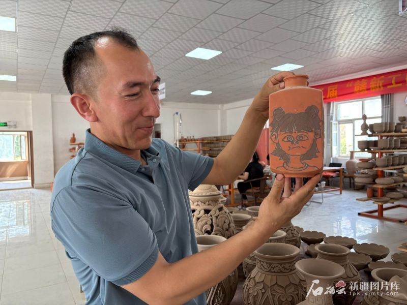6月27日,阿克陶縣巴仁鄉就業實訓基地內的米拉斯土陶手工藝專業合作社負責人奧布力塔力普·阿吉,展示徒弟製作的土陶作品。石榴雲/新疆日報記者 王晶晶攝