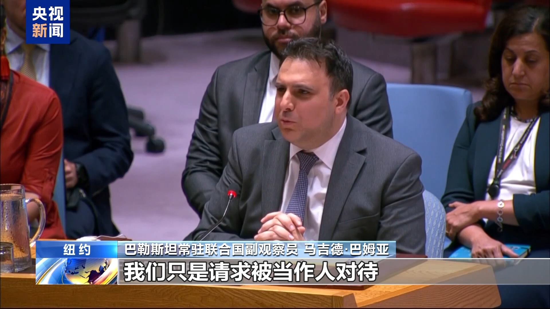 *巴勒斯坦常駐聯合國副觀察員 馬吉德·巴姆亞:*我們只是請求被當作人對待,這不過分吧?暗示我們不配得到這樣的對待,或是我們應該對所有遭遇逆來順受並心存感激,這是種侮辱。既然談到對人道救援人員的襲擊,那我們就應該來談談,對人道工作人員、聯合國工作人員的襲擊,至於哈馬斯……