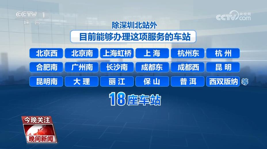 除深圳北站外,目前能夠辦理這項服務的車站還有北京西、北京南、上海虹橋、上海、杭州東、杭州、合肥南、廣州南、長沙南、成都東、成都西、昆明、昆明南、大理、麗江、保山、普洱、西雙版納等18座車站。已購車票的旅客可通過鐵路12306App預約“輕裝行”服務。