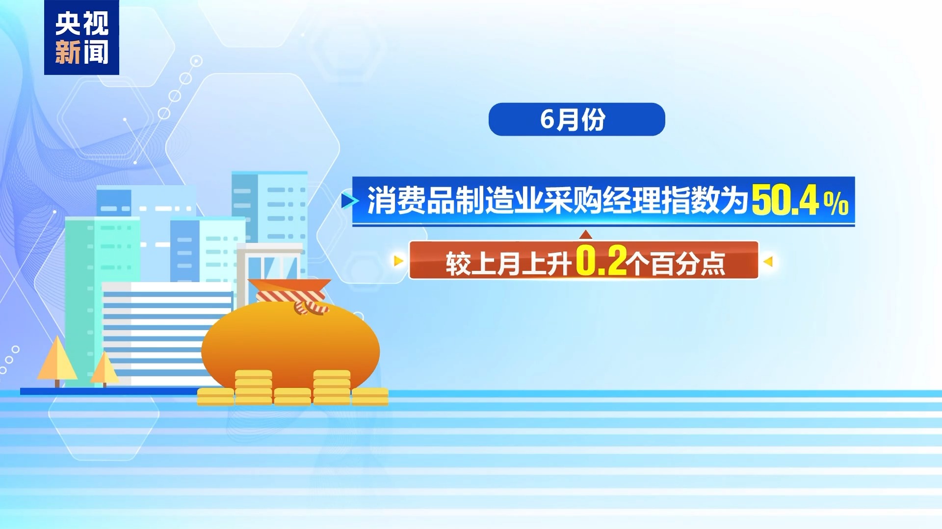 在一系列促消費政策的落實顯效下,消費品製造業也實現穩中有增。6月份消費品製造業採購經理指數為50.4%,較上月上升0.2個百分點。基礎原材料行業運行也有所回穩,基礎原材料行業採購經理指數較上月上升0.8個百分點,結束了連續3個月下行態勢。