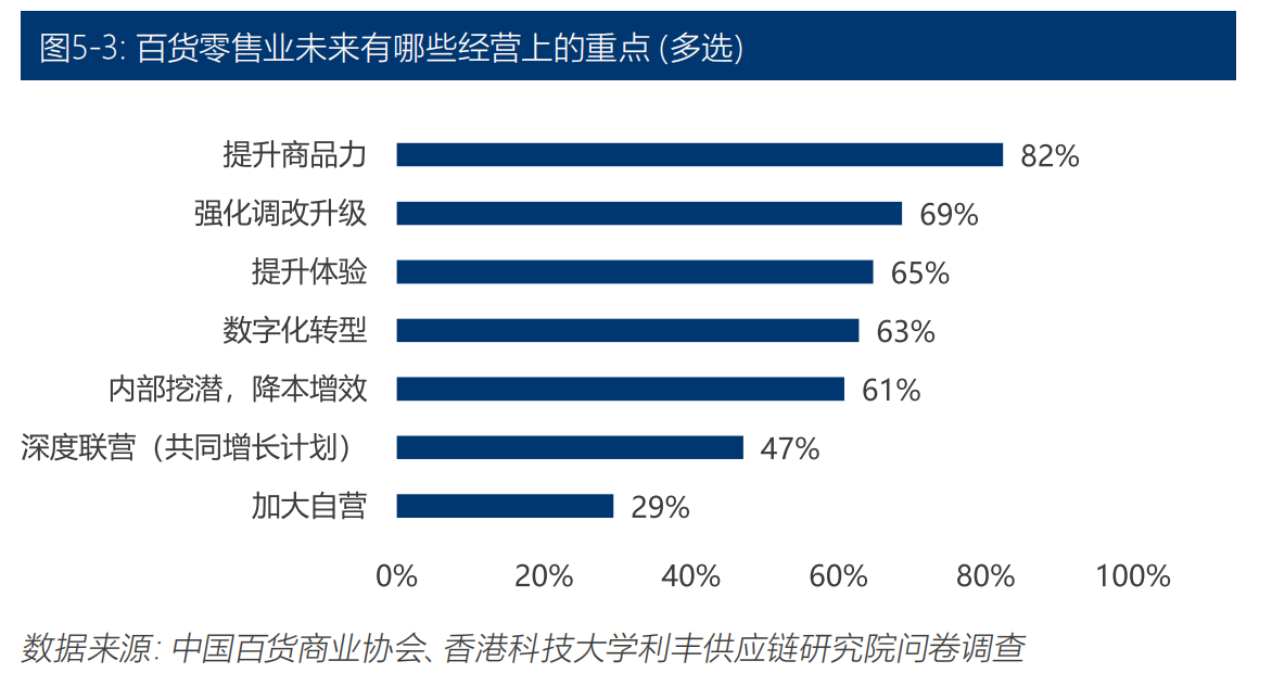 面對當前行業態勢,商超百貨企業也在積極尋找破局路徑。《2024-2025年中國百貨零售業發展報告》顯示,在消費需求分化、競爭加劇的當下,百貨零售企業正通過多維調改重塑商業,從實體空間、業態組合、商品品類與戰略定位等領域的系統性升級,推動百貨零售業加速從傳統賣場轉型。其中,“提升商品力”“調改升級”和“體驗感升級”已成為眾多百貨零售業企業在接下來三到五年的重要任務,而這些要素背後所對應的,則是對供應鏈的迭代升級和企業自我革新。