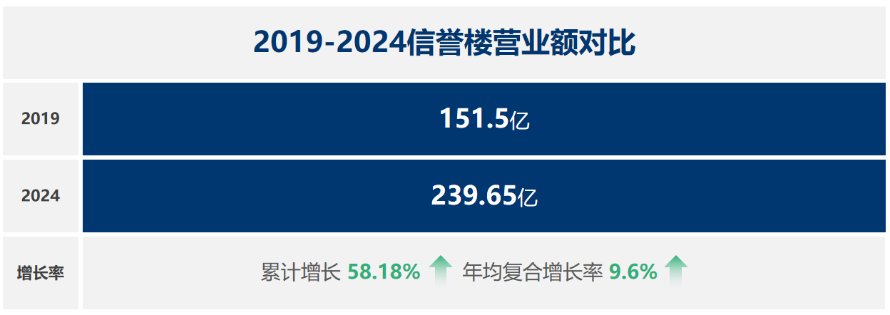 五年時間,“摸着石頭變革”的信譽樓以43家門店構築了環渤海縣域商業網絡,240個直採基地架起品質供應鏈,完成了從田間到餐桌的全程溯源、每日抽檢的品控體系。信譽樓也實現了營業額連續5年正增長,從2019年的151.5億增至2024年的239.65億,五年累計增幅高達58.18%,年均複合增長率高達9.6%,實現了企業效益的高質量增長。