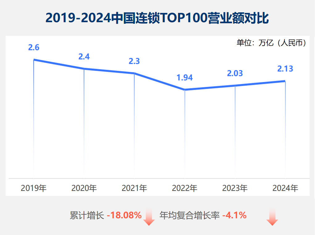 【環球網財經記者 田剛】6月18日,中國連鎖經營協會發布的《2024年中國連鎖Top100》榜單顯示,百強營業額萎縮至2.13萬億,相較於2019年下滑0.47萬億,下調18.08%,且尚未呈現出顯著回彈態勢。2024年,商超百貨行業持續承壓,多家知名企業營業收入和淨利潤均呈現下降態勢;部分商超百貨企業發展受阻,業績遭遇上升瓶頸,行業整體進入震盪調整週期。據不完全統計,2024年度A股26家商超百貨上市公司中,有19家營收同比下滑、17家淨利同比下滑。