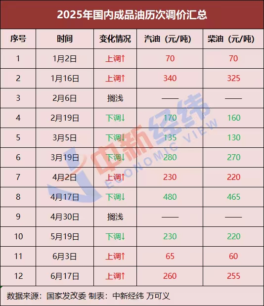 中新經緯注意到,今年以來,國內油價已經歷十二輪調價窗口,分別為“五漲五跌兩擱淺”。漲跌互抵後,國內汽、柴油價格每噸較去年底分別下調330元、315元。若本輪調整落地,2025年調價格局將變為“六漲五跌兩擱淺”。
