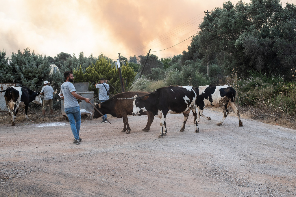 當地時間2025年6月30日,土耳其伊茲密爾省塞費裏希薩爾區,村民在野火中轉移牲畜。