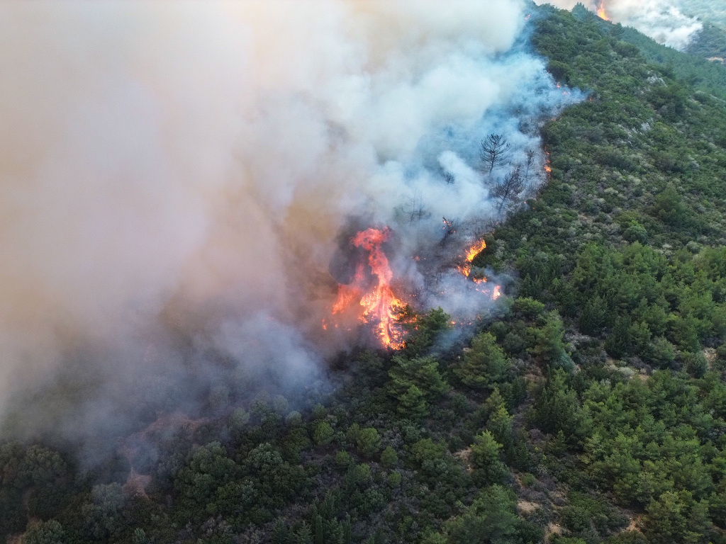 當地時間2025年6月30日,土耳其伊茲密爾省塞費裏希薩爾區,無人機航拍顯示當地發生森林火災。