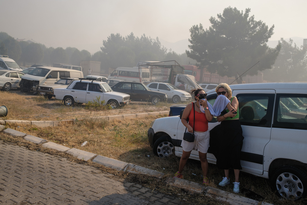 當地時間2025年6月29日,土耳其,伊茲密爾多地發生森林火災,城市被煙霧籠罩,人們逃離火災現場。