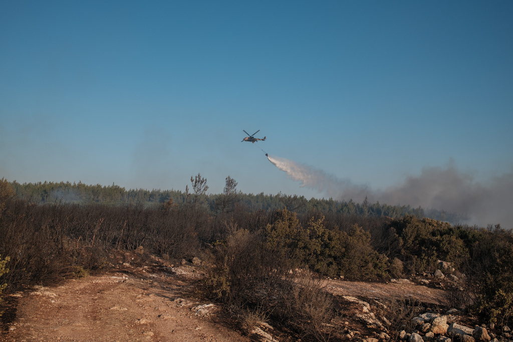 當地時間2025年6月29日,土耳其伊茲密爾,一架直升機正在撲滅森林火災。