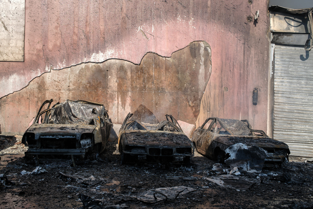 當地時間2025年6月29日,土耳其伊茲密爾,汽車在森林火災中被燒燬。