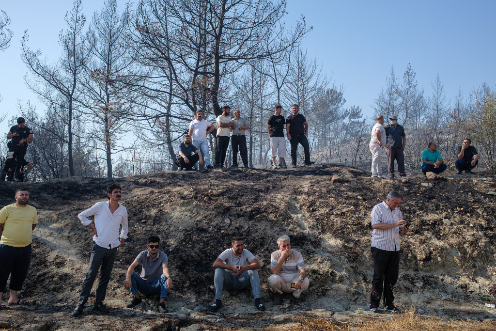 當地時間2025年6月29日,土耳其伊茲密爾,人們看着被大火燒燬的房屋。