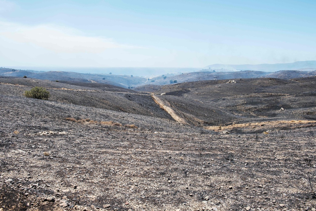 當地時間2025年6月30日,土耳其伊茲密爾省塞費裏希薩爾區,一張照片顯示了野火爆發後的燒燬區域。
