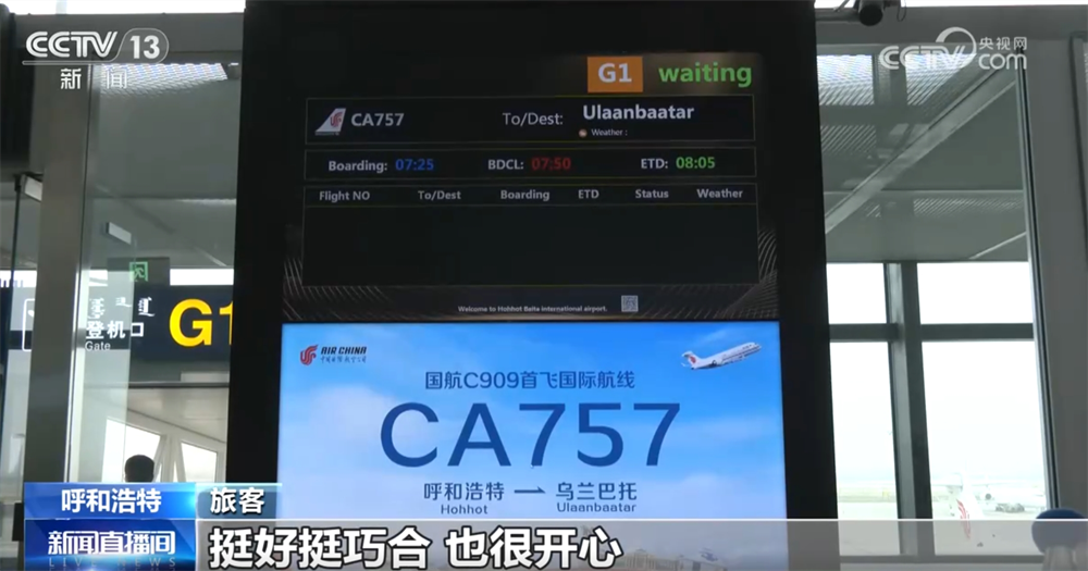 上午8時07分,身披“五星紅旗”的CA757航班搭載着74名旅客,從呼和浩特白塔國際機場起飛,前往烏蘭巴托國際機場。