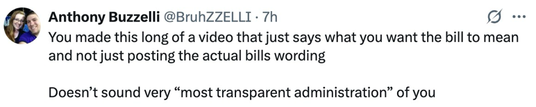 該視頻在社交平台X上引發爭議。有網友表示,“你們製作了一個這麼長的視頻,只説了你們希望這個法案能表達的意思,而不是直接發佈法案的具體內容。這不像你們説的‘最透明的政府’。”↓