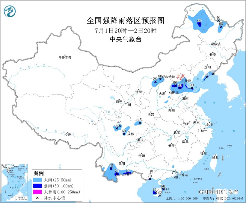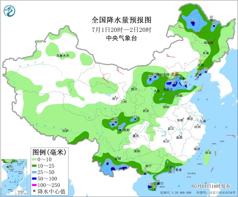 預計,7月1日20時至2日20時,內蒙古東北部和河套地區、黑龍江西北部、遼寧東南部、陝西北部、北京東部、河北中南部、天津、山東北部、川西高原北部、四川盆地西北部、雲南南部、廣西東南部沿海、廣東南部沿海、海南島西部和東部等地部分地區有大到暴雨,局地有大暴雨(100~140毫米)。上述部分地區伴有短時強降水(最大小時降雨量20~50毫米,局地可超過70毫米)(見圖1)。此外,東北地區、黃淮北部等地的部分地區將有8級以上雷暴大風或冰雹天氣,其中,黑龍江中西部等地的部分地區將有10級以上雷暴大風,最大風力可達11級以上,黑龍江中西部等地局地可能出現龍捲天氣。預計,強對流的主要影響時段為明天午後至夜間(見圖2)。中央氣象台7月1日18時繼續發佈暴雨藍色預警併發布強對流天氣藍色預警。