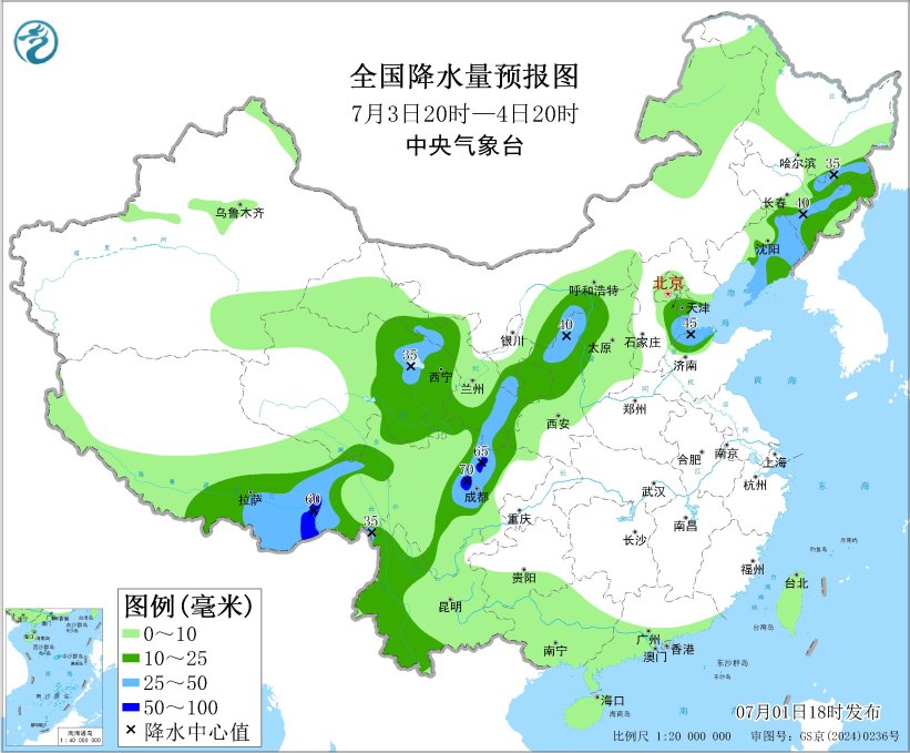 *7月2日20時至3日20時,*東北地區南部、西北地區東南部、陝西北部、華北中北部和南部、西南地區北部和南部、西藏東南部等地部分地區有中到大雨,其中,吉林中部、遼寧中北部、甘肅東南部、河北東部、天津、四川盆地西部等地部分地區有暴雨或大暴雨(100~160毫米)。內蒙古西北部、新疆沿天山地區等地部分地區有4~5級風(見圖4)。南海西南部海域將有4~6級、陣風7級的西南風。