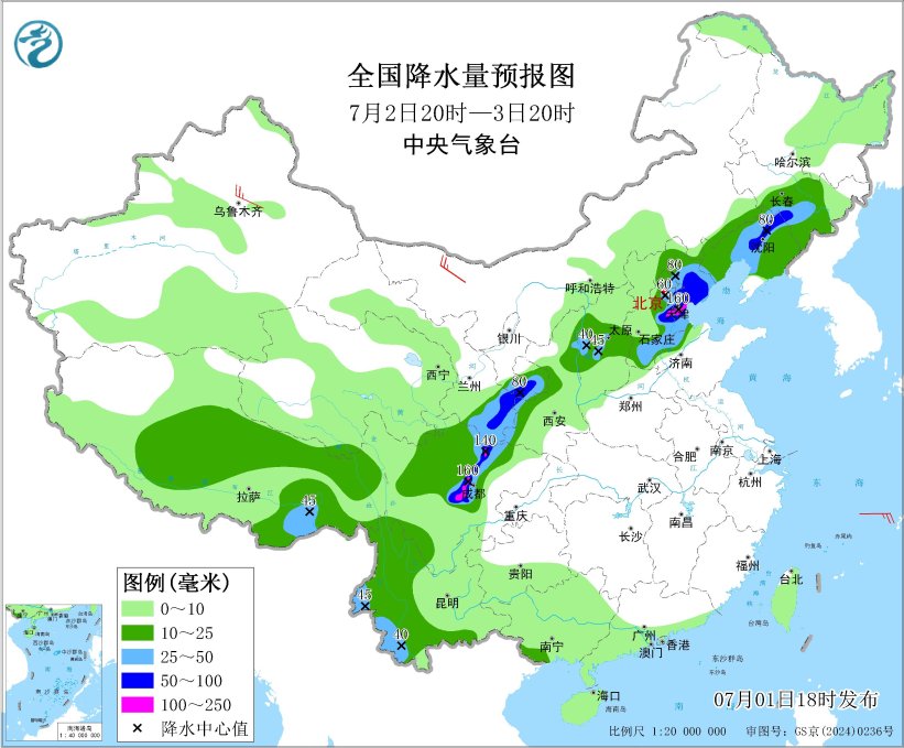 今天白天,河北、遼寧、山東、雲南、廣東、廣西等地部分地區出現較強降雨。預計2日至3日,華北、東北地區將有較強降雨過程和強對流天氣,京津冀遼寧吉林等局地大暴雨,關注對交通運輸、農業生產、暑期旅遊等的影響;未來5天,四川盆地、甘肅、陝西、雲南、西藏等地持續降雨,關注降雨引發的次生災害及影響。未來一週,黃淮、江淮、江漢、江南、華南中東部等地有大範圍持續性高温天氣,關注對城市運行、人體健康等的影響。