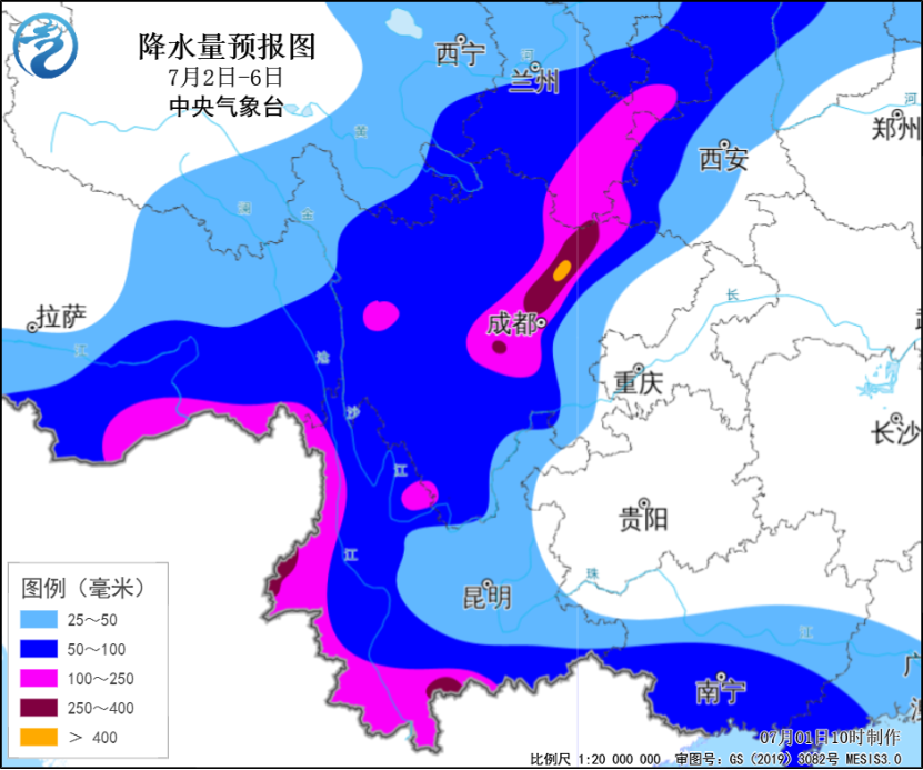 預計7月2日至6日,四川、甘肅、寧夏、陝西、青海東部以及西藏東部、雲南等地多降水天氣,累計降水量40~70毫米,其中四川盆地西部、甘肅南部、陝西西南部以及雲南西部和南部、西藏東南部等地部分地區累計降水量100~250毫米,四川盆地西部局地超過400毫米。四川盆地最強降水時段出現在3日至4日,具有明顯的夜雨增強特徵,最大小時降雨量可達70~100毫米。
