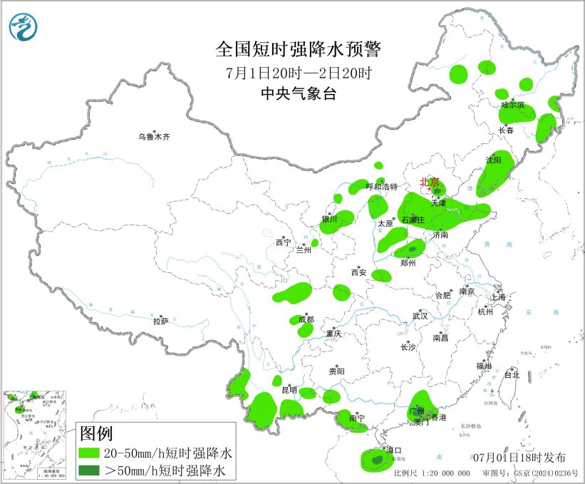 預計7月1日20時至2日20時,東北地區、黃淮北部等地的部分地區將有8級以上雷暴大風或冰雹天氣,其中,黑龍江中西部等地的部分地區將有10級以上雷暴大風,最大風力可達11級以上,黑龍江中西部等地局地可能出現龍捲天氣;東北地區、華北、黃淮北部、西南地區東部、華南南部等地的部分地區將有小時雨量大於20毫米的短時強降水天氣,其中,河北中南部、北京東部、河南北部、廣東中南部、海南島中部等地的部分地區小時雨量大於50毫米,最大可達70毫米以上。