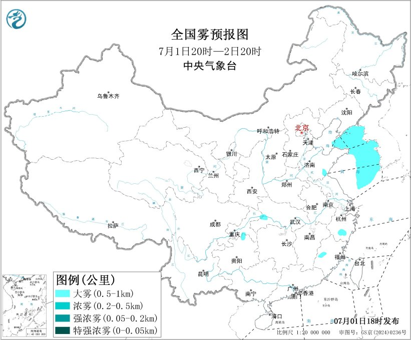 中央氣象台7月1日18時發佈大霧黃色預警:
