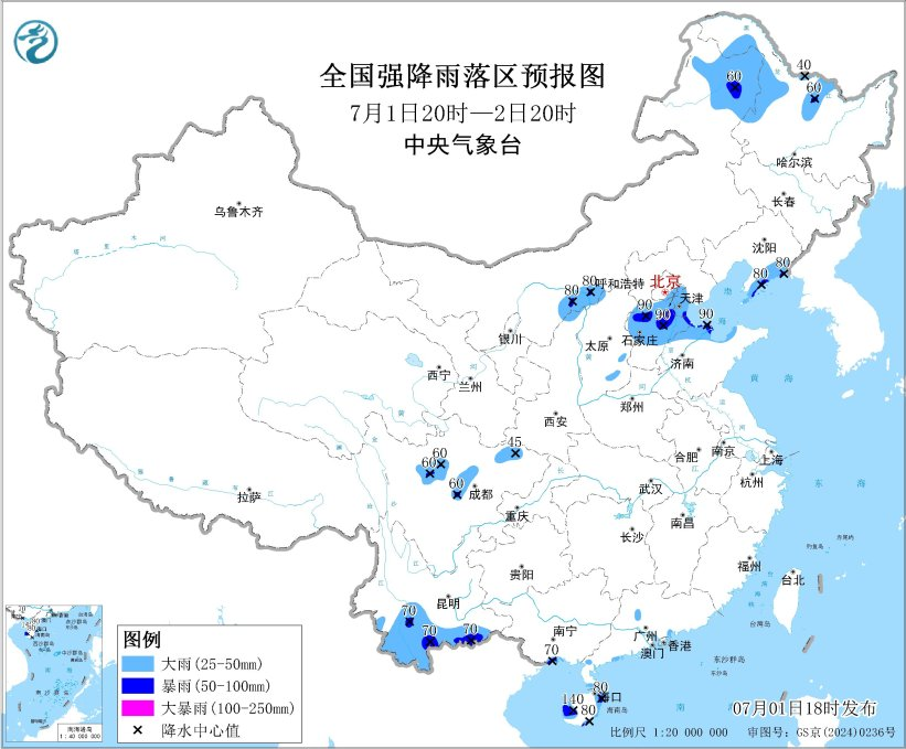 預計,7月1日20時至2日20時,內蒙古東北部和河套地區、黑龍江西北部、遼寧東南部、陝西北部、北京東部、河北中南部、天津、山東北部、川西高原北部、四川盆地西北部、雲南南部、廣西東南部沿海、廣東南部沿海、海南島西部和東部等地部分地區有大到暴雨,局地有大暴雨(100~140毫米)。上述部分地區伴有短時強降水(最大小時降雨量20~50毫米,局地可超過70毫米),局地有雷暴大風等強對流天氣。