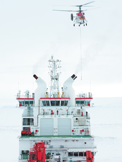 一次卸貨任務中,承擔人員轉運任務的“雪鷹301”直升機正在降落“雪龍2”號艉甲板。