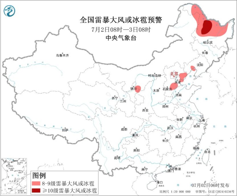 此外,今天,東北地區、華北東部等地部分地區將有8級以上雷暴大風或冰雹天氣,其中,黑龍江中西部部分地區將有10級以上雷暴大風,最大風力可達11級以上,局地還可能出現龍捲天氣。強對流的主要影響時段為今天午後至夜間,請公眾注意關注預報、預警信息,避免在強對流活躍時段外出。