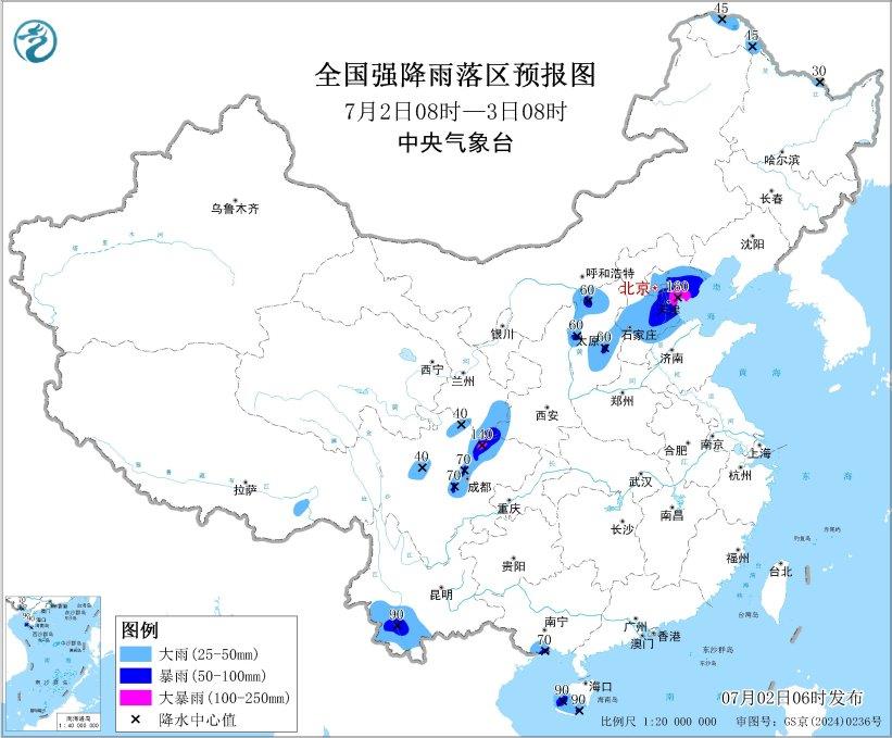 預計,7月2日8時至3日8時,山西中北部、河北中南部和東北部、北京大部、天津、山東北部、四川盆地西北部、甘肅東南部、陝西西南部、雲南西南部、廣西南部沿海、海南島西南部、黑龍江西北部等地部分地區有大到暴雨,其中,河北東北部、天津中東部、四川盆地西北部等地局地有大暴雨(100~160毫米)。