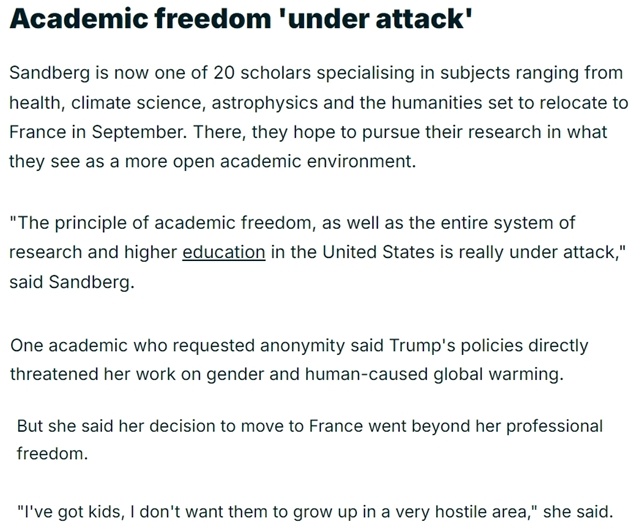 還有一位女學者告訴媒體,美國現政府的政策直接威脅到她有關氣候變暖等方面的研究工作,她搬到法國不僅是為了學術自由,還是因為不想讓自己的孩子“在一個充滿敵意的地方長大”。