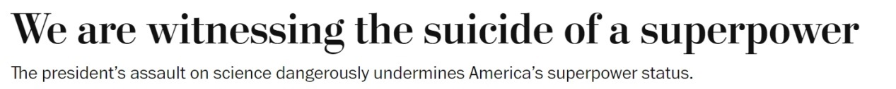 《華盛頓郵報》也刊文警告,美國現政府一直宣稱要讓美國“再次偉大”,但如今它卻正在對美國實力的真正來源——包括對科學研究的長期投資——造成嚴重的且可能無法彌補的損害。