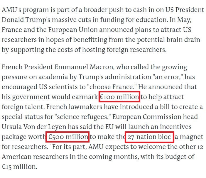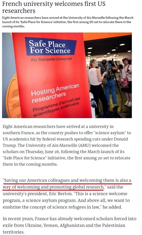用艾克斯-馬賽大學校長埃裏克·伯頓的話説,“拯救並歡迎我們的美國同事也是促進全球科研事業的一種方式”。