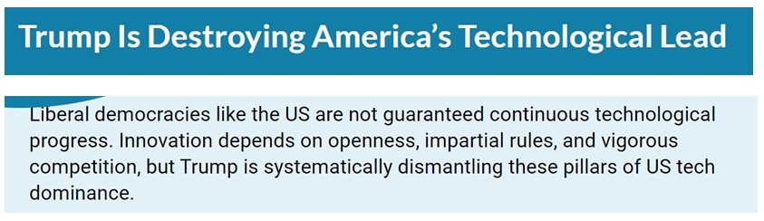 文章稱,研究機構、人才、資金等一直是支撐美國創新發展的重要支柱,而美國現政府正在系統性地拆除這些支柱,斷送自己的科技領先地位。