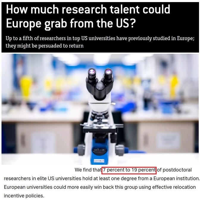 數據顯示,在美國頂級大學工作的博士後中,有7%到19%曾在歐洲獲得學位。對於這些人來説,歐洲有着更強的吸引力。