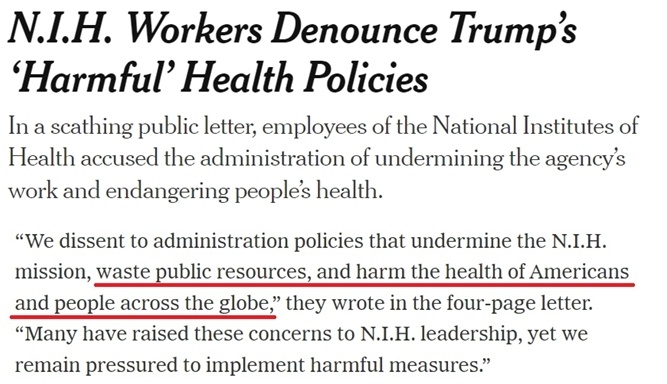 近日,NIH近百名現任和新近被解職的職員發表聯名信,批評美國現政府“有害”的衞生政策危害美國和全球人民的健康,將科學研究政治化並浪費公共資源。