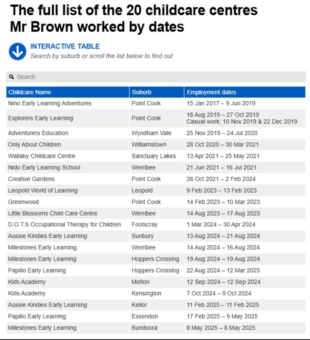 布朗被控涉及兒童強姦、性侵以及製作和散播兒童虐待材料等罪行。布朗尚未對指控提出抗辯,目前被還押候審,預計將於9月在墨爾本地方法院出庭。當局在記者會上表示,布朗持有有效的兒童工作證,並在被捕時仍是託兒所工作人員。警方透露布朗沒有案底,並相信其為單獨作案,且相關罪行僅發生於維多利亞州。