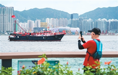 七月一日,由香港各界慶典委員會組織的二十八艘漁船在香港維多利亞港海面巡遊。