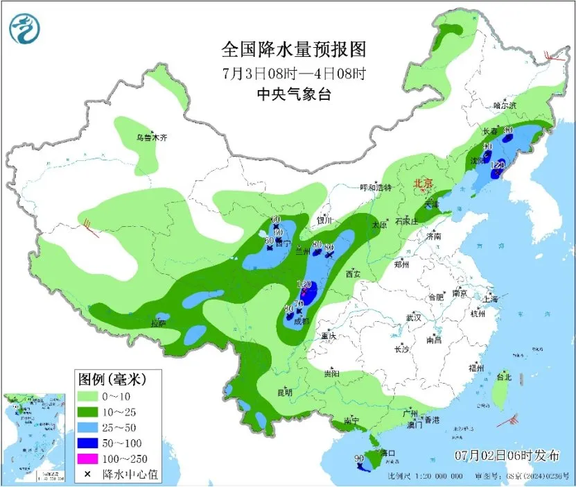 預計,7月2日14時至3日14時,山西中北部、河北中南部和東北部、北京大部、天津、山東北部、四川盆地西部、甘肅東南部、陝西西南部和北部、寧夏南部、雲南西南部、廣西南部沿海、海南島西南部、遼寧中部和南部、黑龍江西北部等地的部分地區有大到暴雨,其中,河北東部、天津中東部、四川盆地西北部等地局地有大暴雨(100~160毫米)。上述部分地區伴有短時強降水(最大小時降雨量20~50毫米,局地可超過70毫米),局地有雷暴大風等強對流天氣。