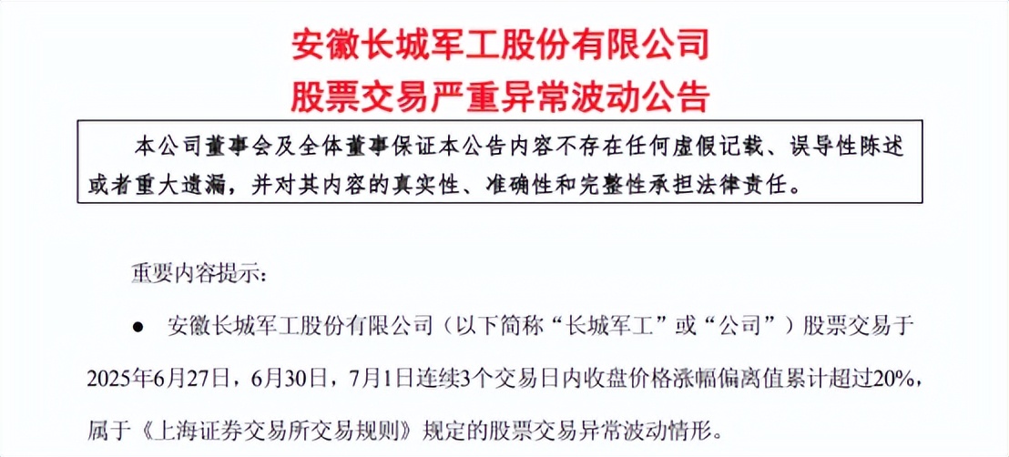 【環球網財經綜合報道】7月1日晚間,長城軍工(601606.SH)發佈股票交易風險提示公告,表示公司股票近期波動嚴重異常,存在市場情緒過熱、非理性炒作及短期大幅下跌風險,提醒投資者注意投資風險。