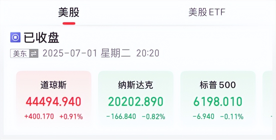 【環球網財經綜合報道】當地時間週二,美股三大指數收盤漲跌不一,道瓊斯工業平均指數上漲400.17點,收於44494.94點,漲幅0.91%;標準普爾500指數小幅下跌6.94點,收於6198.01點,跌幅0.11%;納斯達克綜合指數下跌166.84點,收於20202.89點,跌幅0.82%。