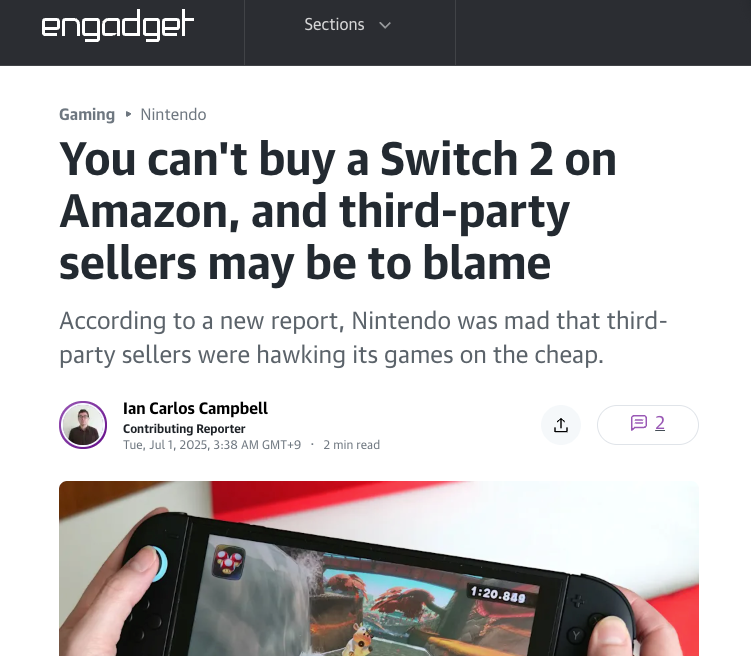 【環球網科技綜合報道】7月2日消息,據多家外媒報道,針對彭博社近日關於“任天堂因第三方商家低價串貨問題,將Switch 2遊戲機從亞馬遜美國下架”的報道,任天堂官方予以否認,稱相關內容“與事實不符”,並重申“不會公開與零售商的合作細節”。這一表態與亞馬遜此前“致力於提供豐富任天堂產品”的回應形成呼應,但雙方均未進一步解釋Switch 2持續缺席美國亞馬遜平台的具體原因。