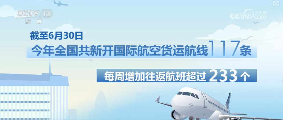 據中物聯航空物流分會統計,截至6月30日,2025年,全國共新開國際航空貨運航線117條,每週增加往返航班超過233個。