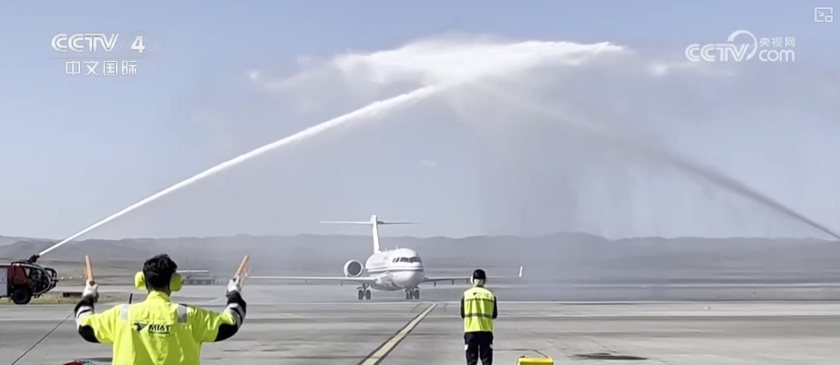 7月1日,噴塗有五星紅旗的國航C909飛機首次執飛呼和浩特-烏蘭巴托-呼和浩特航線,開啓了國產飛機載旗執行國際商業航班的新階段。74名旅客從呼和浩特白塔國際機場起飛,經過了一個多小時的飛行抵達烏蘭巴托國際機場,機場以民航界最高禮遇“水門儀式”相迎。