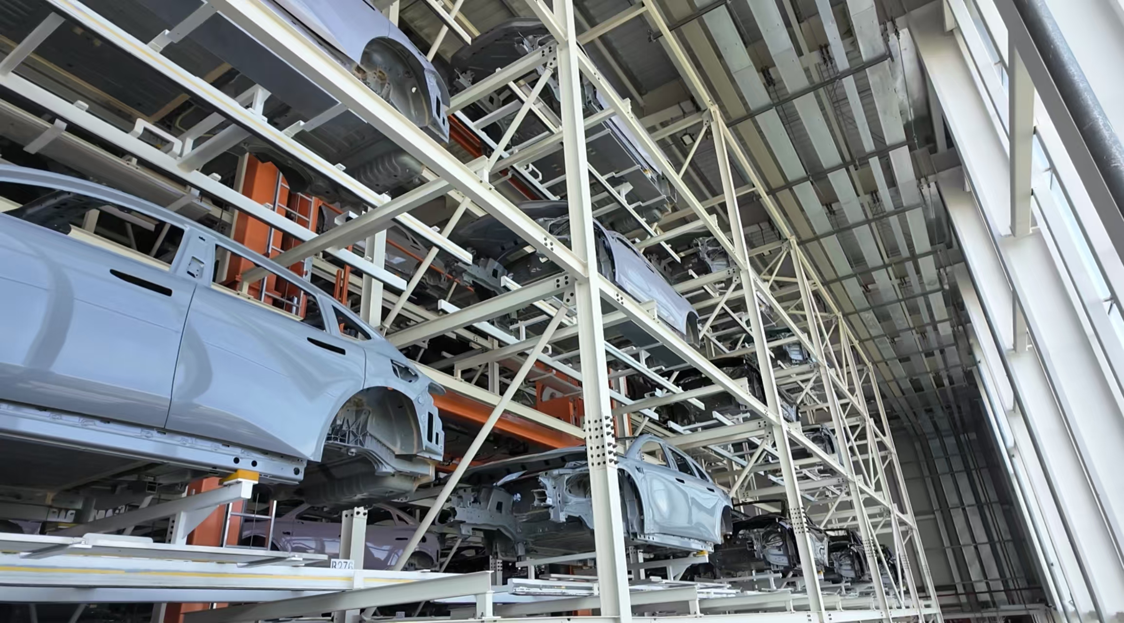 穿過空中連廊,腳下是令人驚歎的智能製造圖景:右側智能駕駛測試跑道車輛穿梭,左側電控工廠內自動化設備高效運轉。連廊盡頭,全球首創的智能化RGV立體庫吸引了大家的目光。6層立體庫中設置了408個車位,如同巨型“抓娃娃機”,機械臂精準抓取不同顏色的車身,打破了傳統“先進先出”的桎梏。