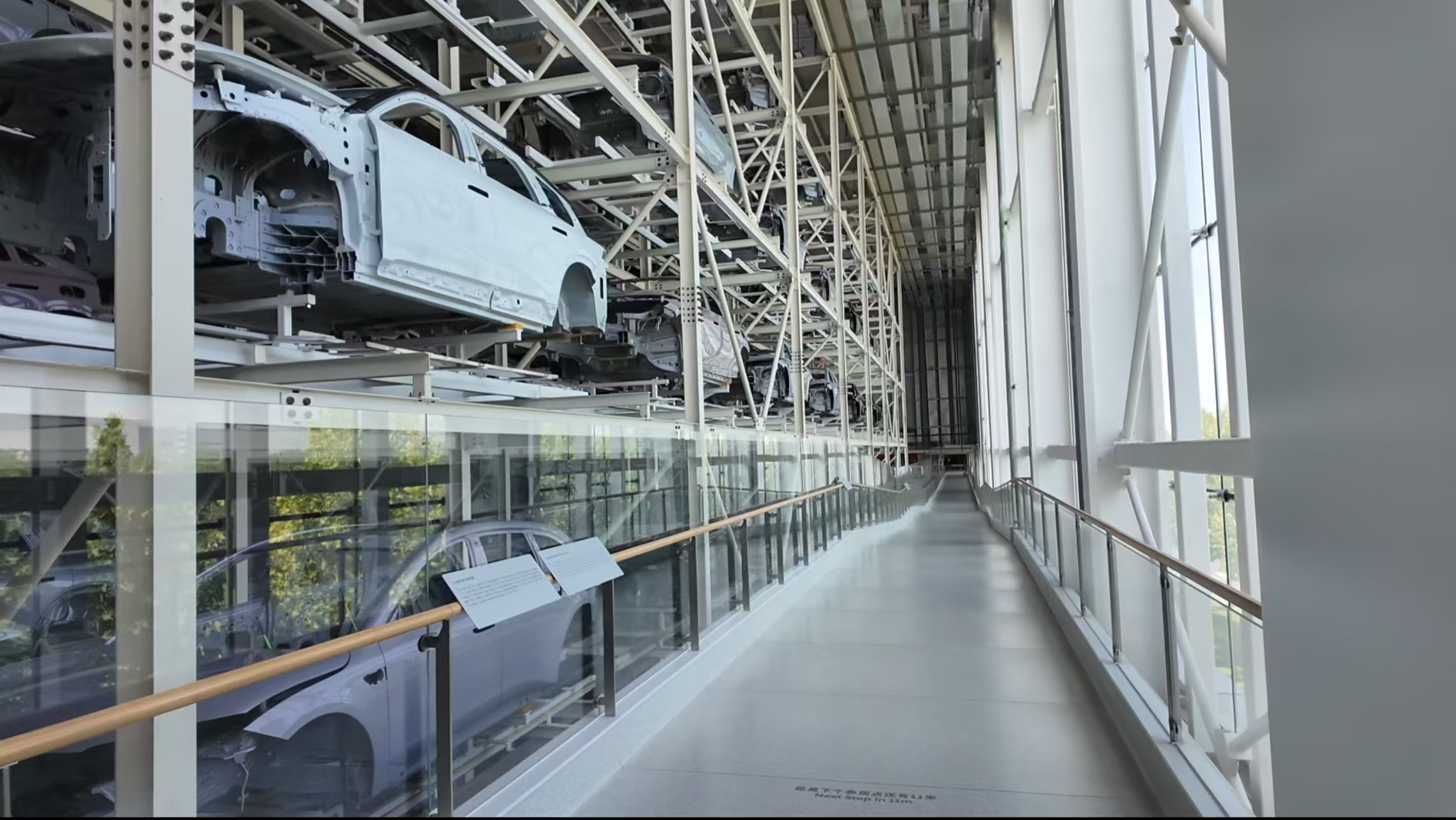走進車身車間,941台機器人組成的全自動化產線正高效運作,在空中揮舞的機械臂彷彿正演繹現代工業芭蕾。記者注意到,這裏沒有飛濺的焊接火花,只有鉚接槍精準的咔嗒聲。“這台機械臂搭載了3D視覺系統,精度達到0.05毫米,相當於頭髮絲的1/15。”楊易指向正在安裝車門的機器人——98秒內,四台機器人協作完成定位、匹配、鉸鏈安裝全套工序,“可以説又快又準。”