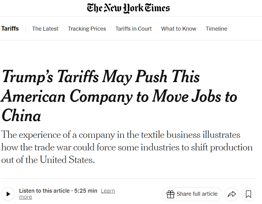 文章説,特朗普政府發起的全球貿易戰動搖了Cocona Labs公司的經濟基礎。受到美國關税不確定性的影響,加之中國實施的對等反制措施,這家美國公司將開始做出改變:將其核心產品的部分生產從美國轉移到中國的工廠生產。