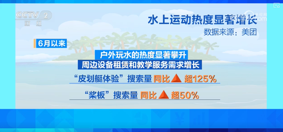 數據顯示,6月以來,户外玩水的熱度顯著攀升,周邊設備租賃和教學服務需求增長。在互聯網平台,“皮划艇體驗”搜索量同比增長超125%,“槳板”搜索量同比增長超50%。