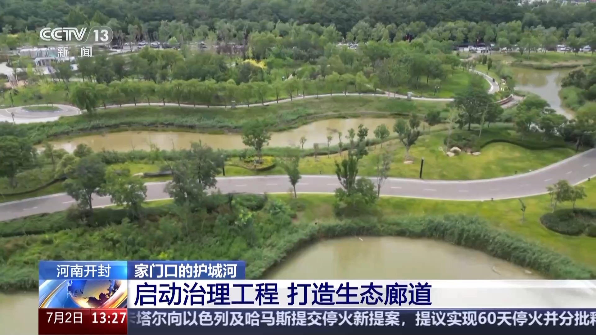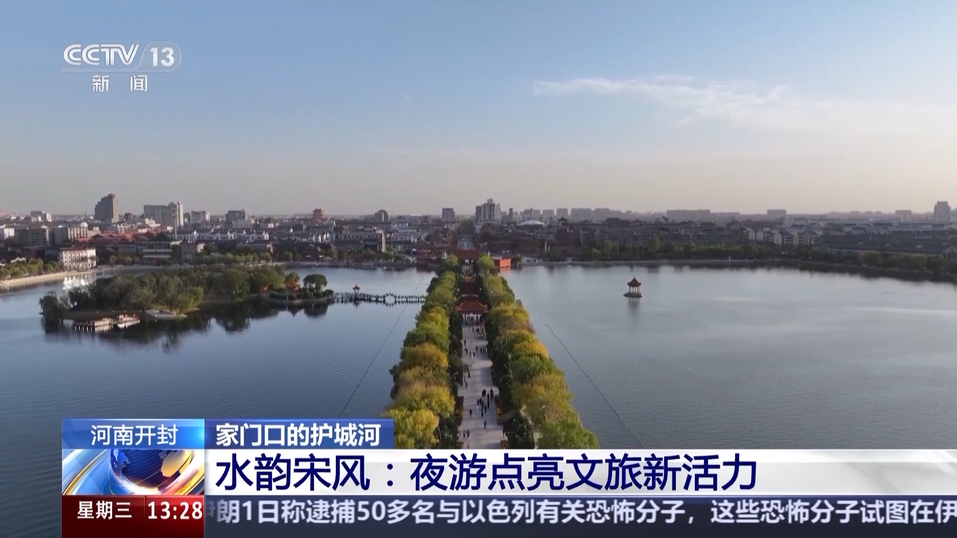 *總枱記者 李恩浩:*我現在所在的位置是明清時代保留的東城牆,在城牆下流淌的就是開封的東護城河。它與西護城河、南護城河、北護城河就像一條玉帶一樣,圍繞着開封古城。現存的四段圍城主河道全長約17.79公里,在過去,它是重要的城防屏障,護佑着開封這座城市的安全。如今護城河已經形成了防洪除澇、休閒娛樂的格局空間。