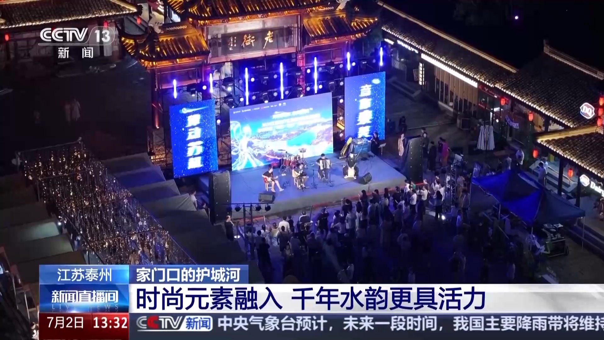 在崑曲的餘音繚繞中,鳳城河畔的商業街悄然披上了流光華裳。青磚黛瓦、飛檐翹角的傳統民居,沿600米長的青石板路錯落分佈,燈光映照下的古建築與鳳城河水面形成水墨畫卷般的景緻。隨着蘇超火熱,眾多客場球迷來泰州看球旅行,鳳城河也是必打卡景點。河畔的廣場上,熱鬧非凡的露天賽事直播和野生音樂會,在每個週末熱鬧上演。