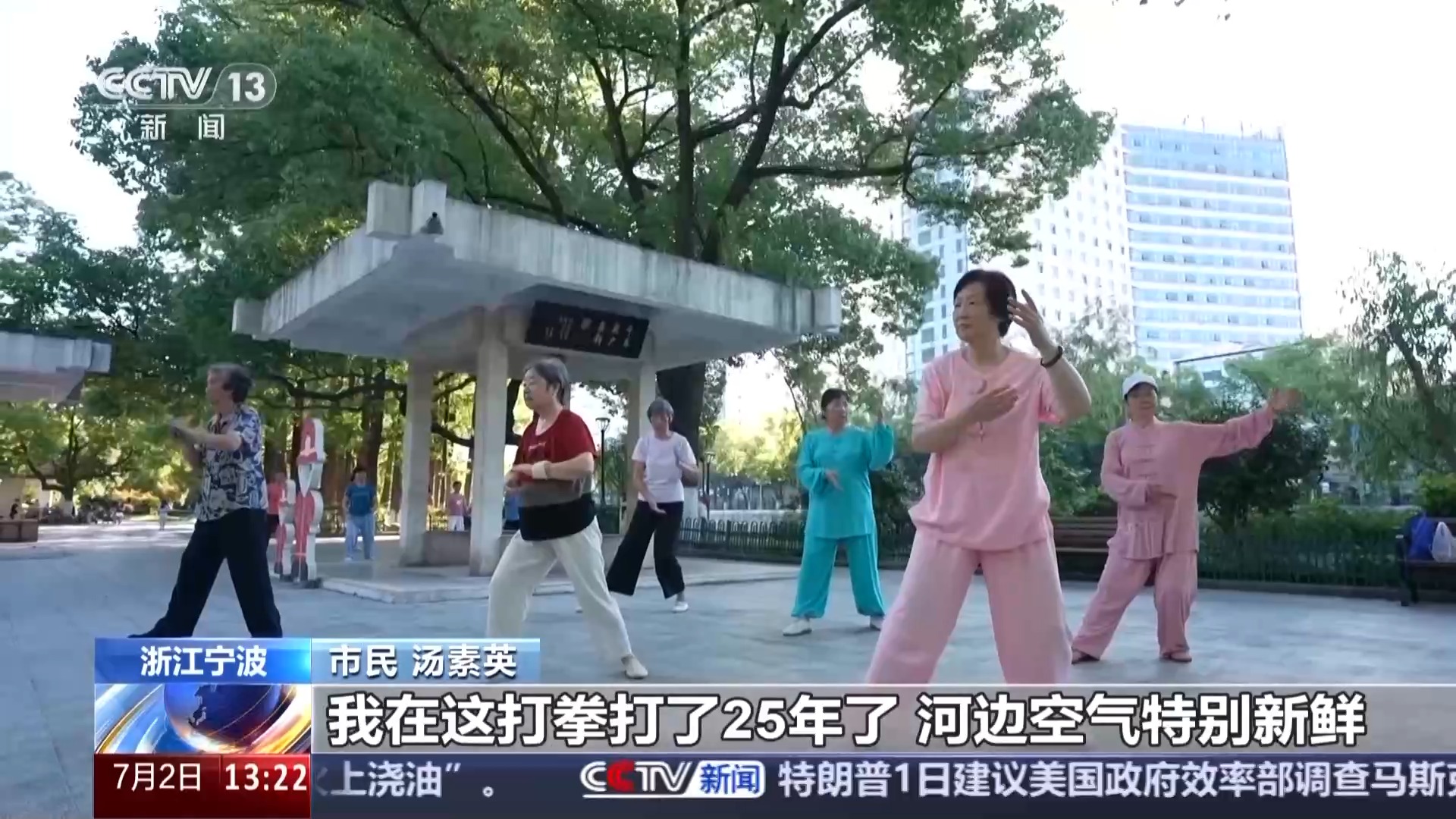 *總枱記者 胡浩然:*我現在是在浙江寧波的海曙公園,迎着朝陽,伴着微風,附近的居民們習慣來到這兒開啓他們的全新一天。您看,多熱鬧!公園有南園北園之分,但都有一個共同的特點,就是沿河而建,而這條河就是寧波的護城河。