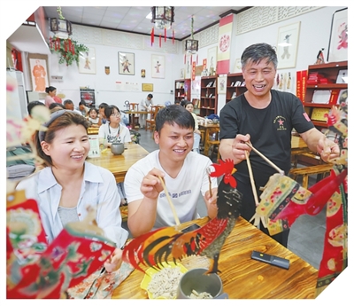 在江西省萍鄉市安源區南正街歷史文化街區皮影戲館,遊客在皮影戲傳承人(右一)指導下體驗傳統文化,感受非遺項目的魅力。